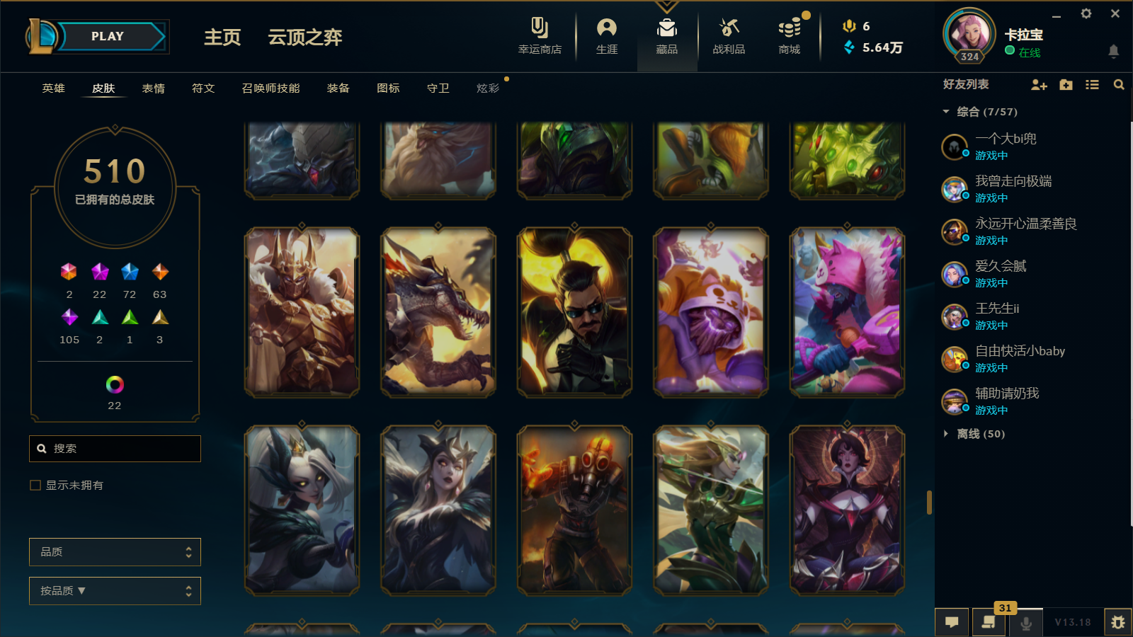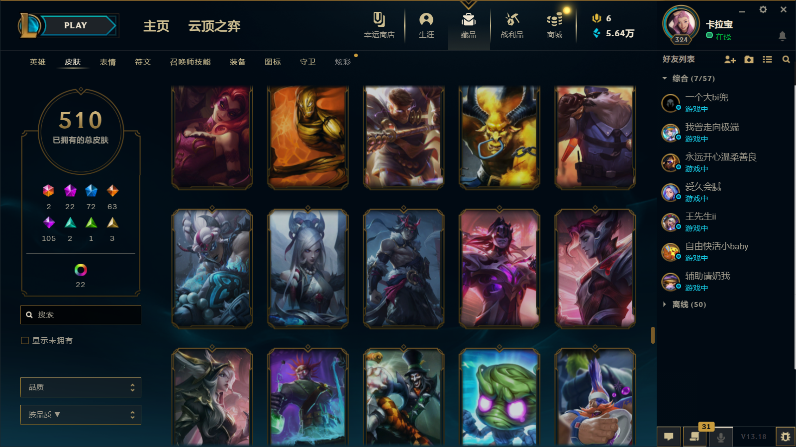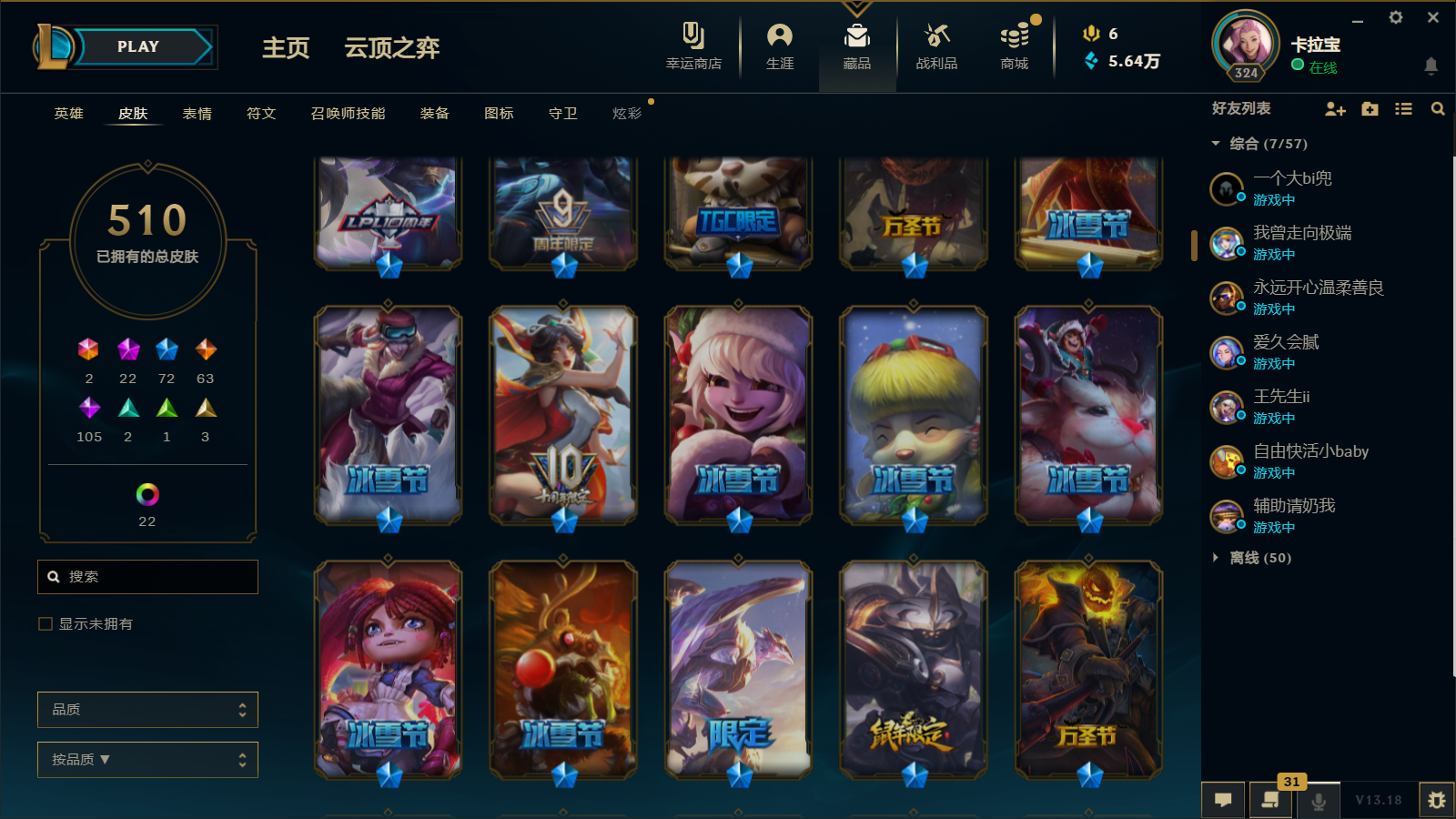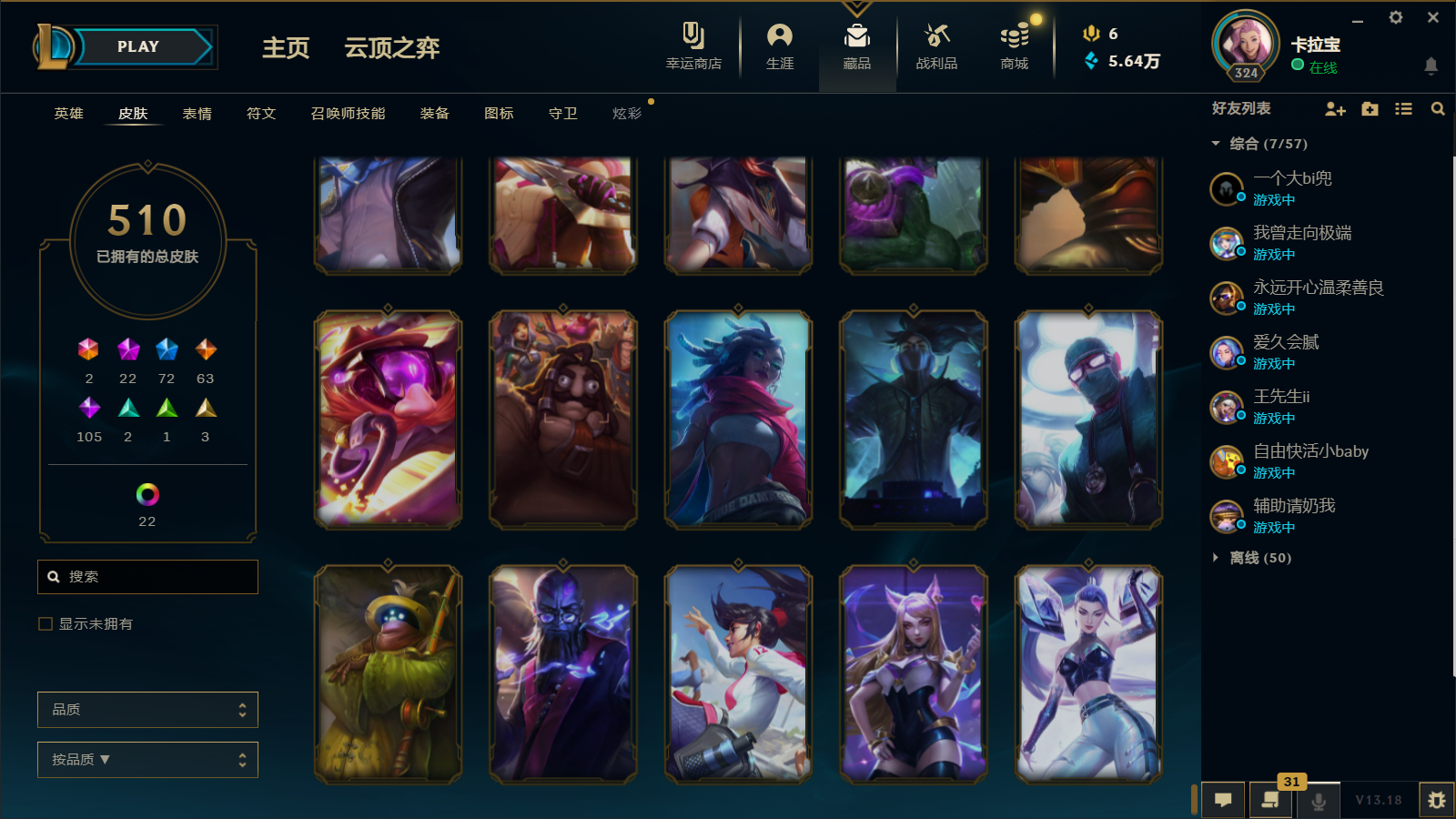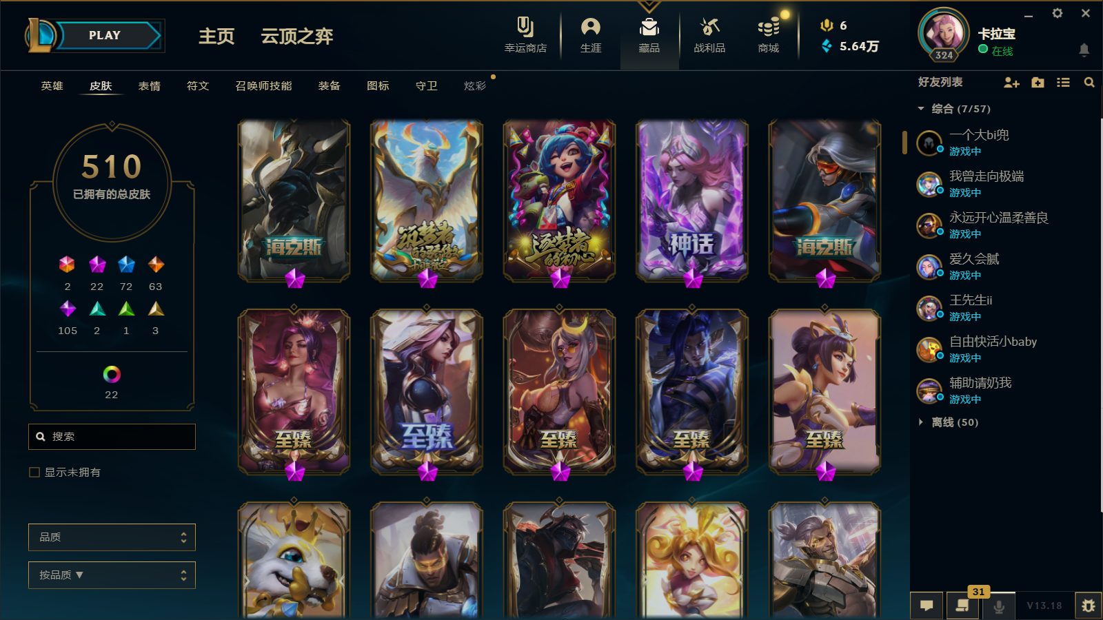 510皮肤 22炫彩 大元素使 DJ琴女 海克斯小炮 海克斯鳄鱼 灰烬莫德凯撒 灰烬派克 灰烬慎 海克斯人马 水晶雷欧娜 海克斯希维尔