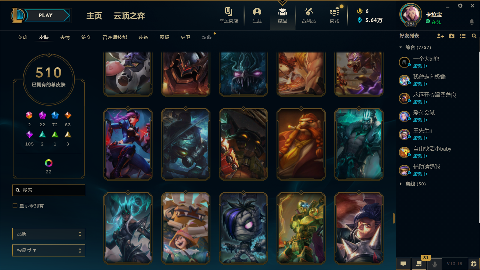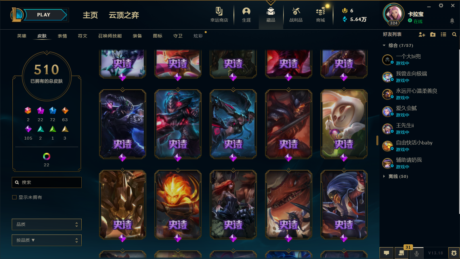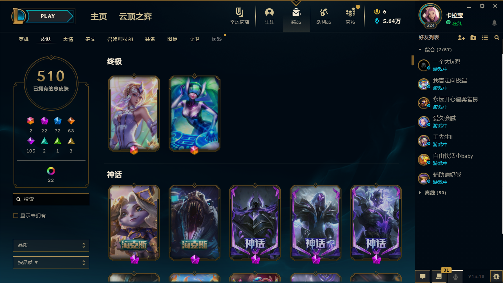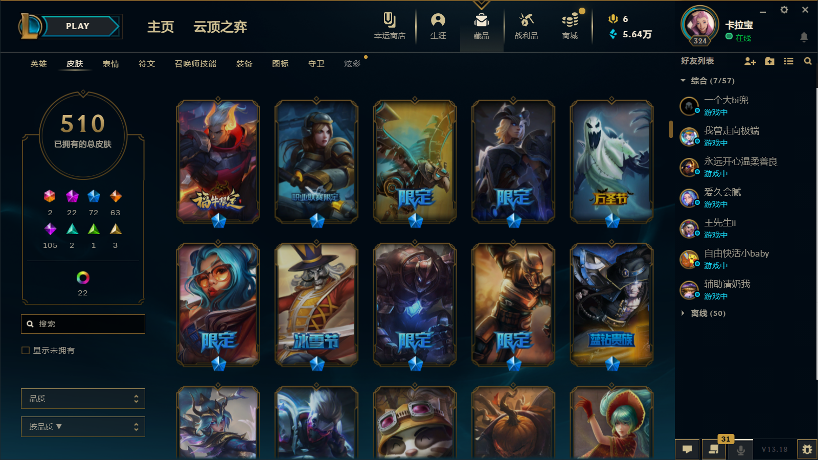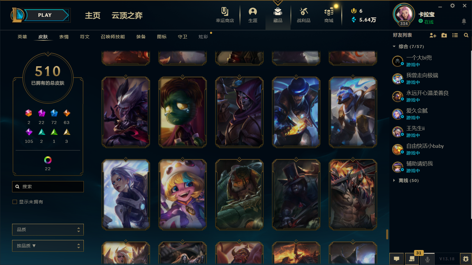 510皮肤 22炫彩 大元素使 DJ琴女 海克斯小炮 海克斯鳄鱼 灰烬莫德凯撒 灰烬派克 灰烬慎 海克斯人马 水晶雷欧娜 海克斯希维尔