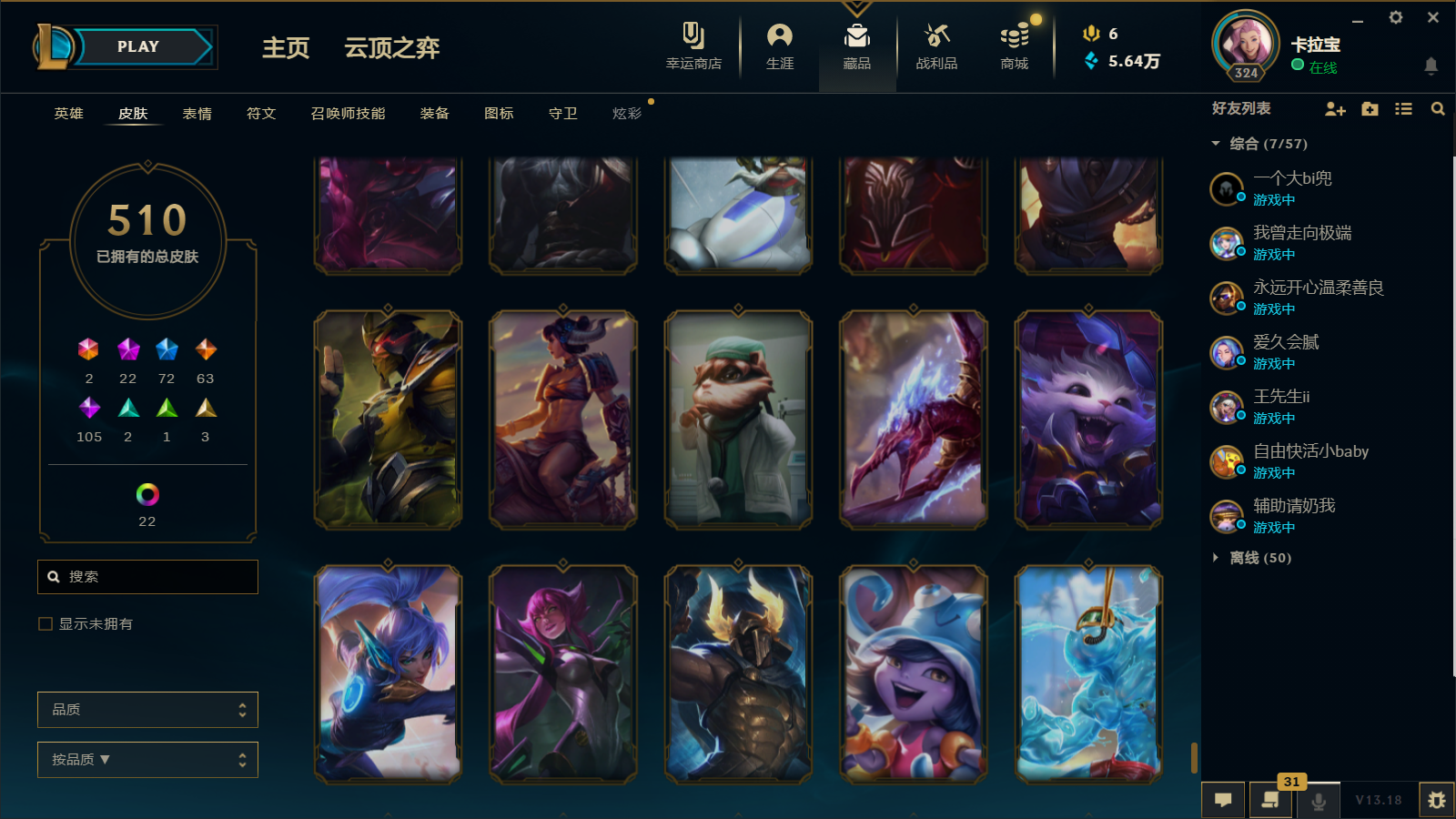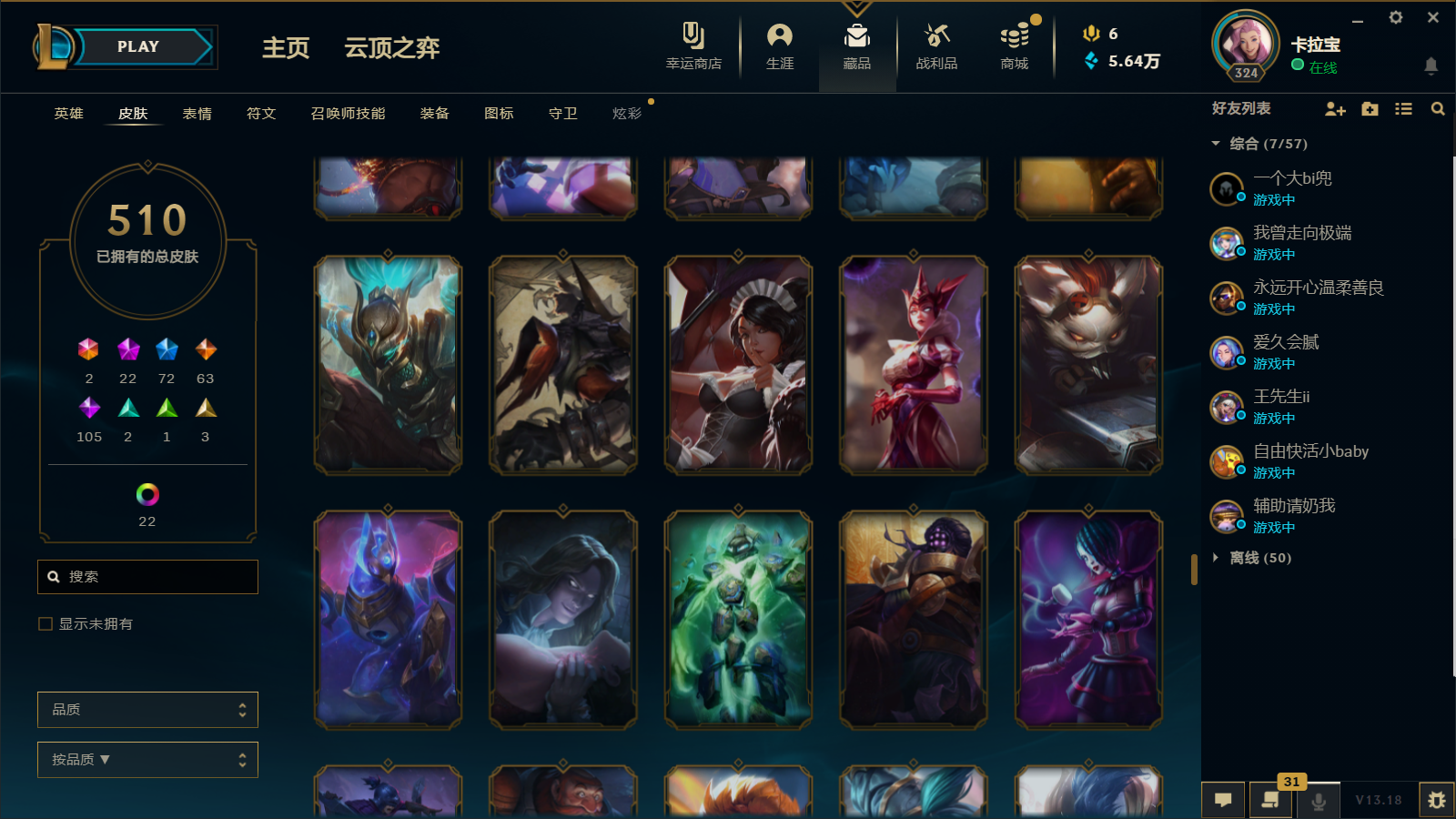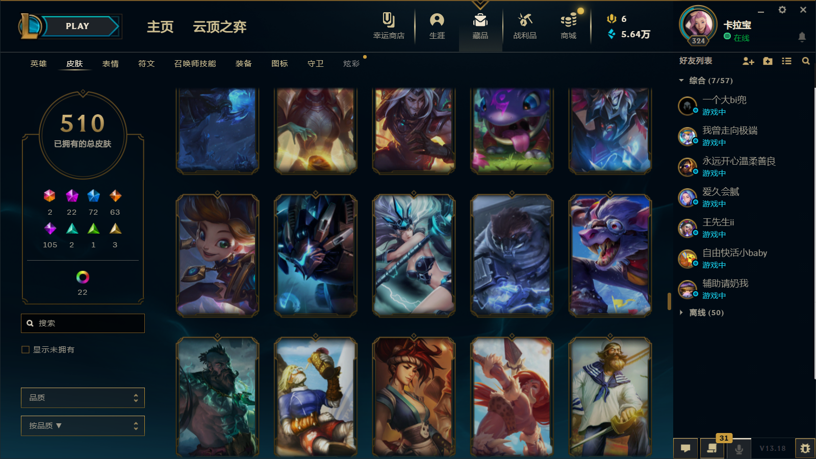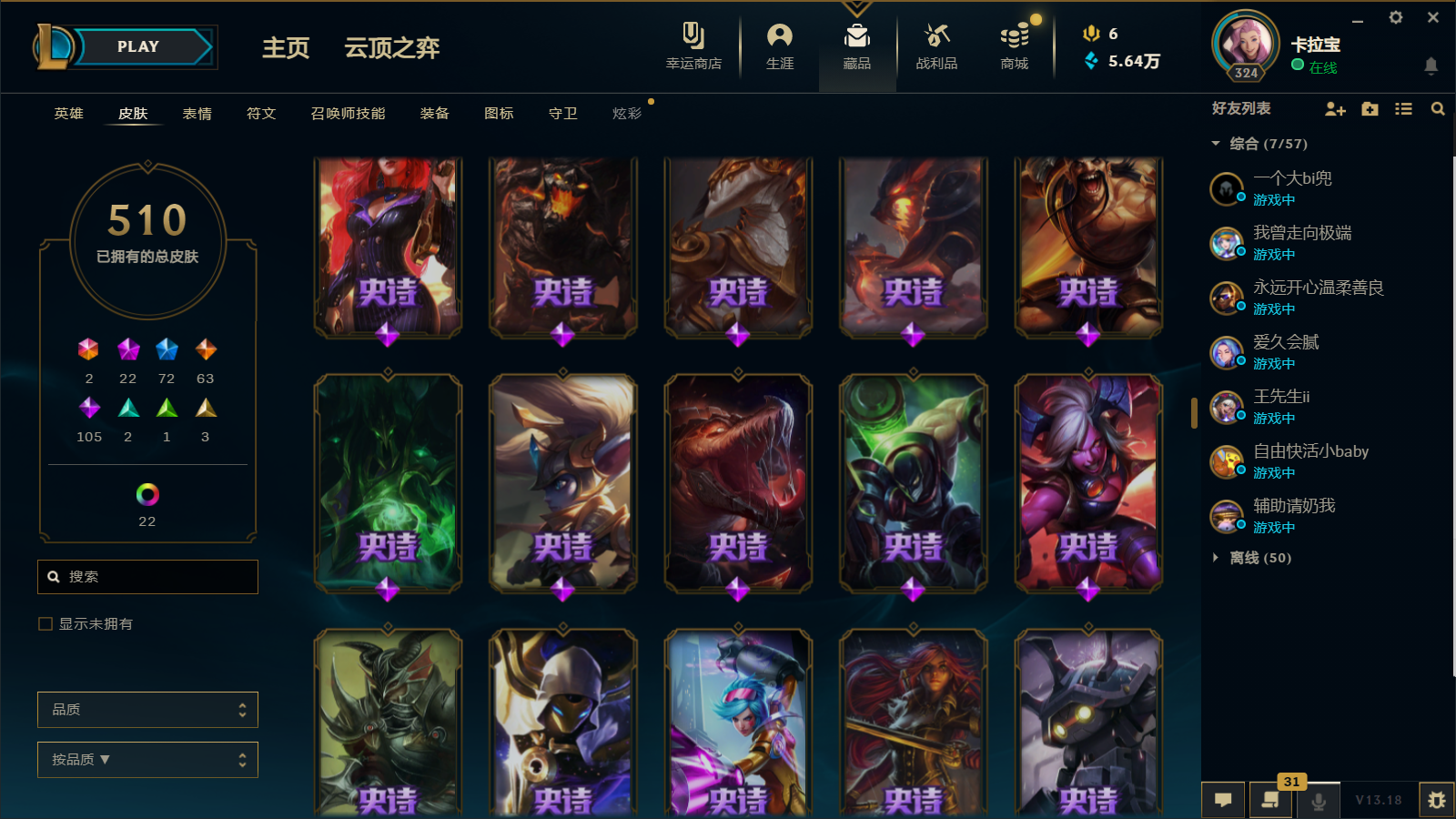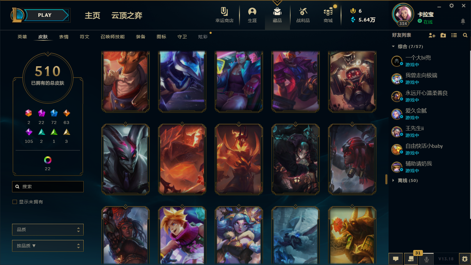 510皮肤 22炫彩 大元素使 DJ琴女 海克斯小炮 海克斯鳄鱼 灰烬莫德凯撒 灰烬派克 灰烬慎 海克斯人马 水晶雷欧娜 海克斯希维尔