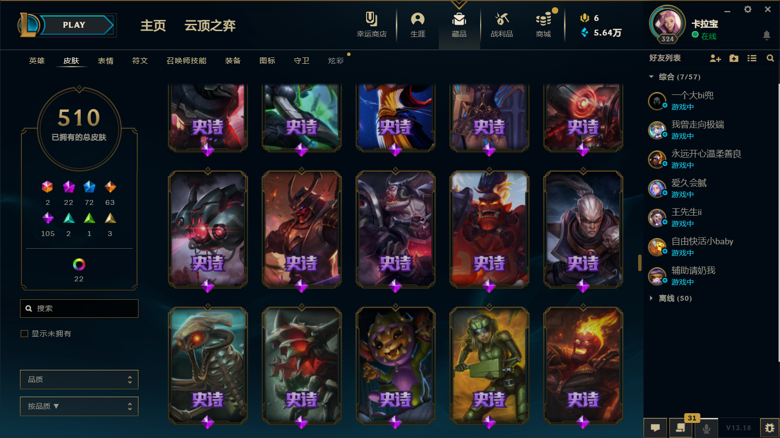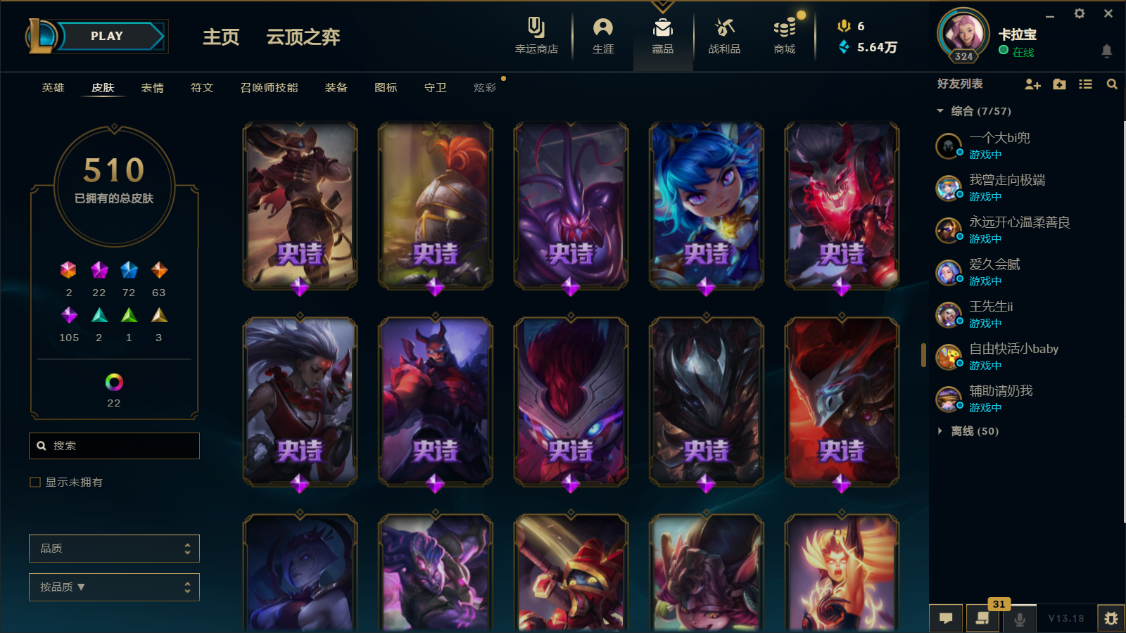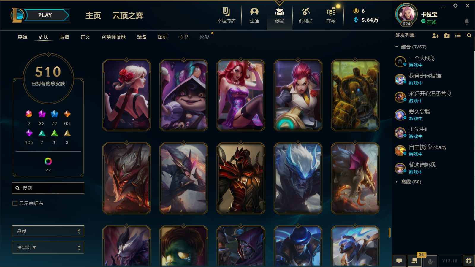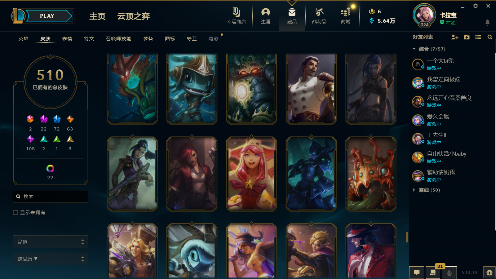 510皮肤 22炫彩 大元素使 DJ琴女 海克斯小炮 海克斯鳄鱼 灰烬莫德凯撒 灰烬派克 灰烬慎 海克斯人马 水晶雷欧娜 海克斯希维尔