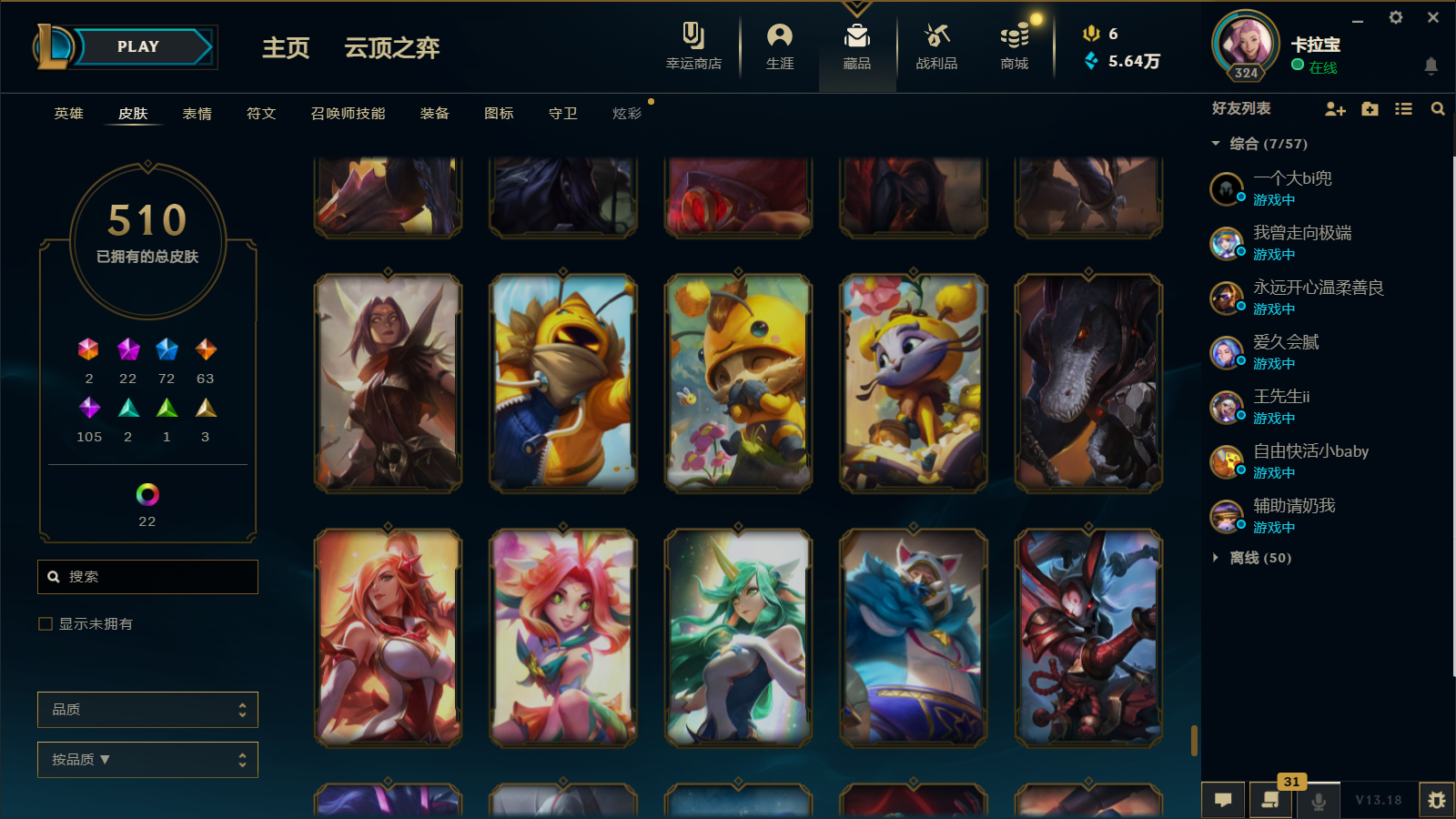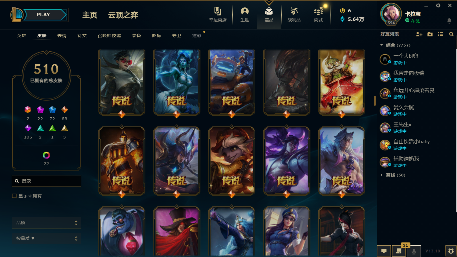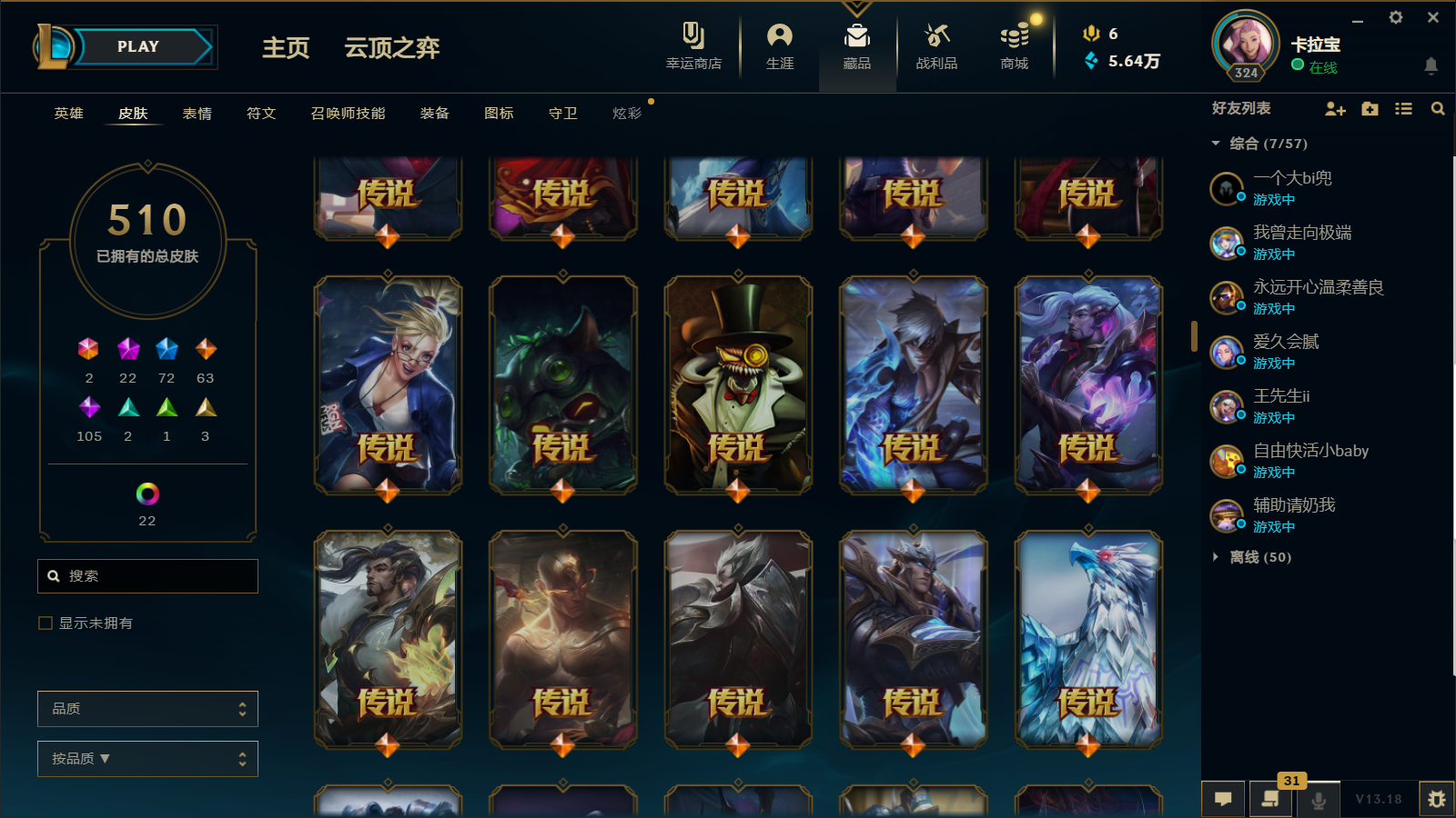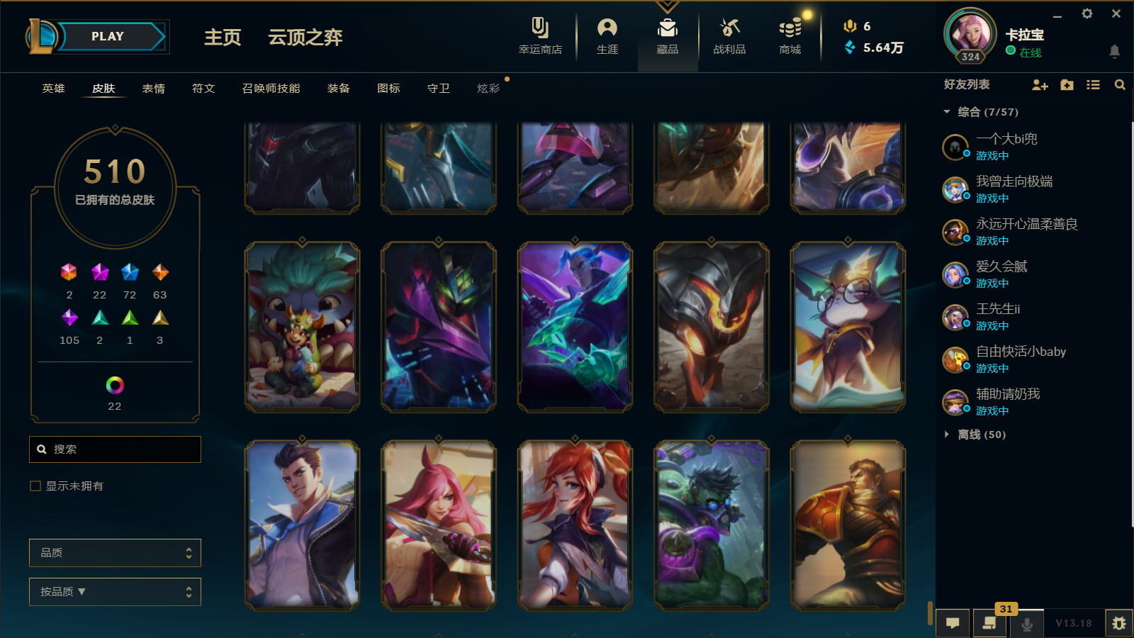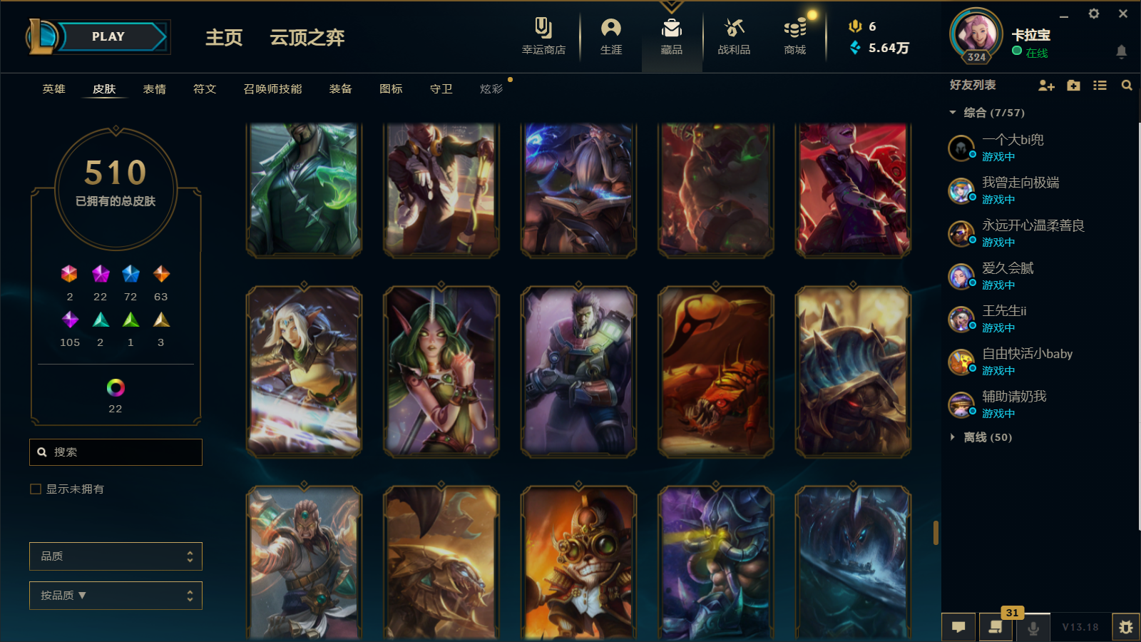 510皮肤 22炫彩 大元素使 DJ琴女 海克斯小炮 海克斯鳄鱼 灰烬莫德凯撒 灰烬派克 灰烬慎 海克斯人马 水晶雷欧娜 海克斯希维尔