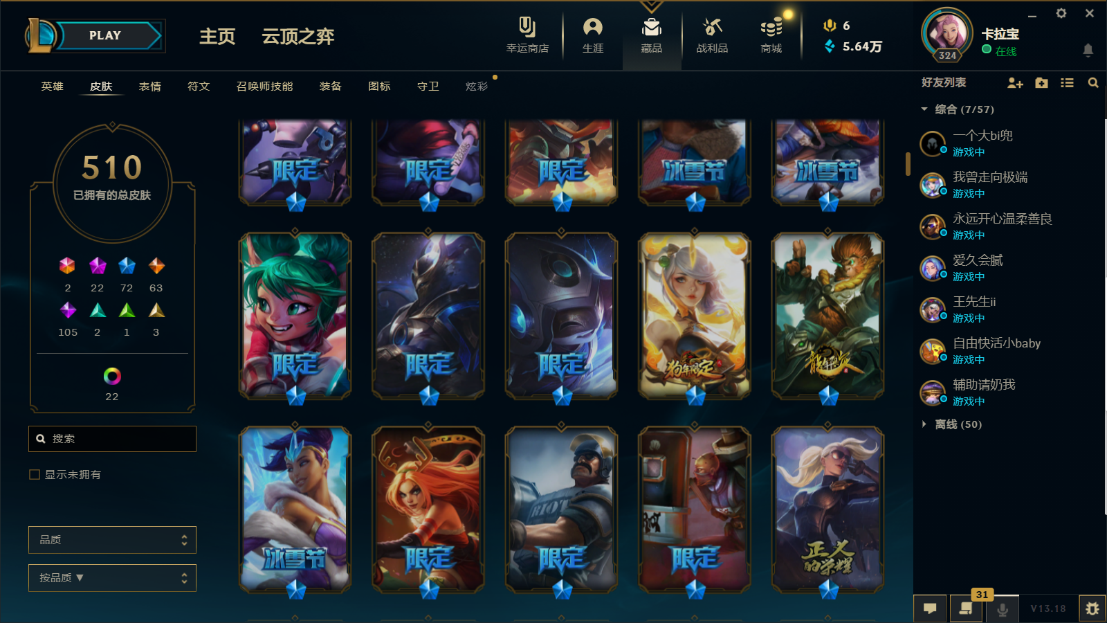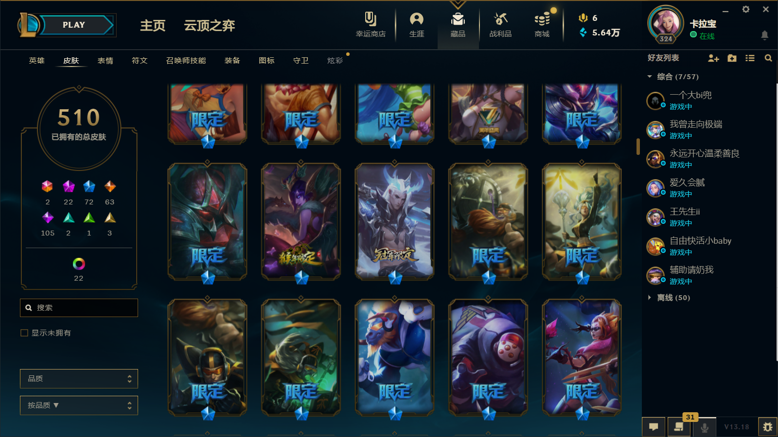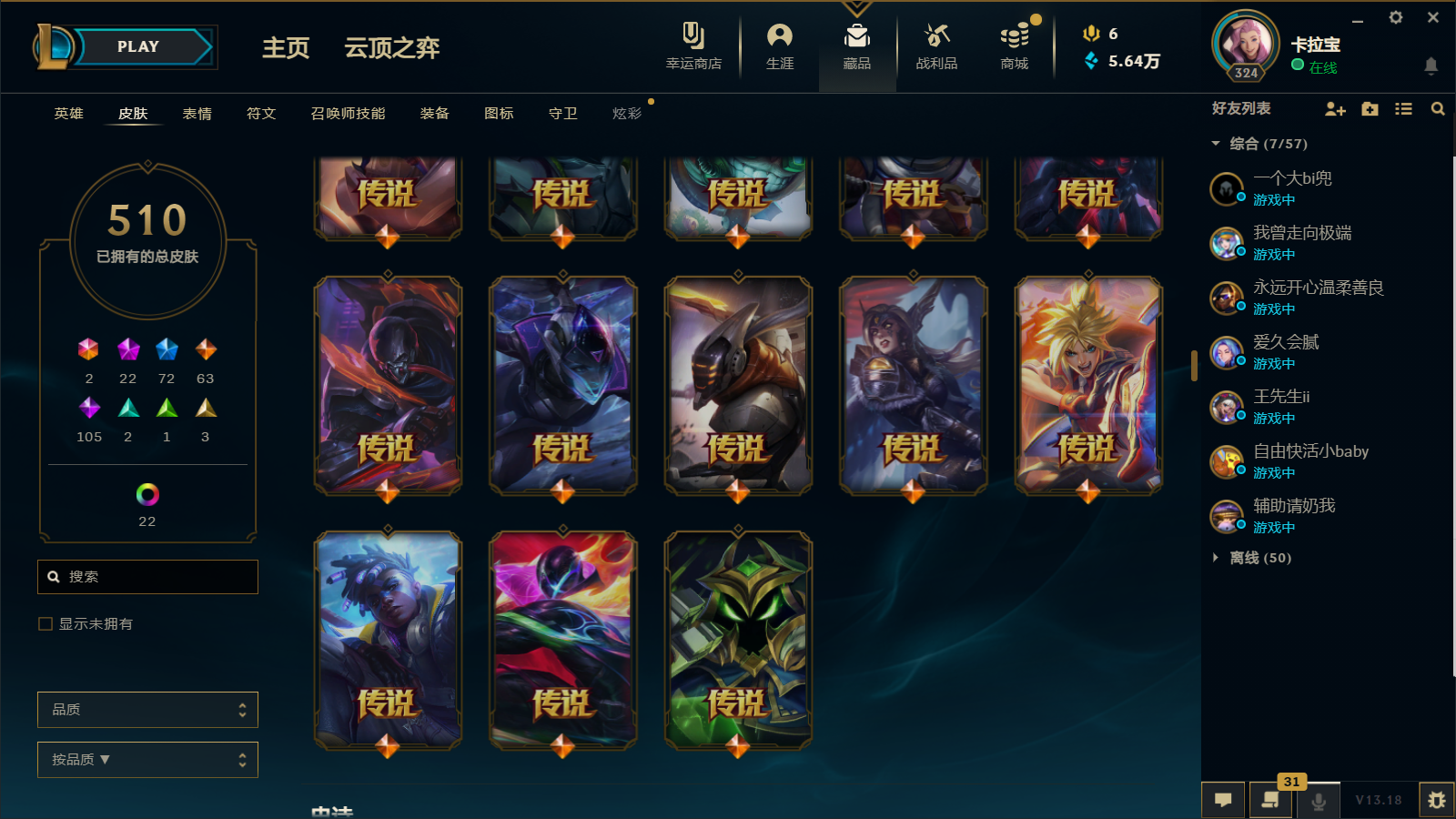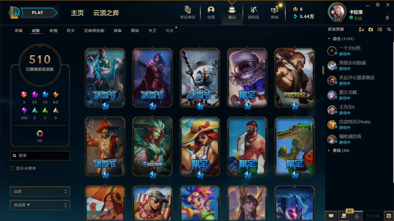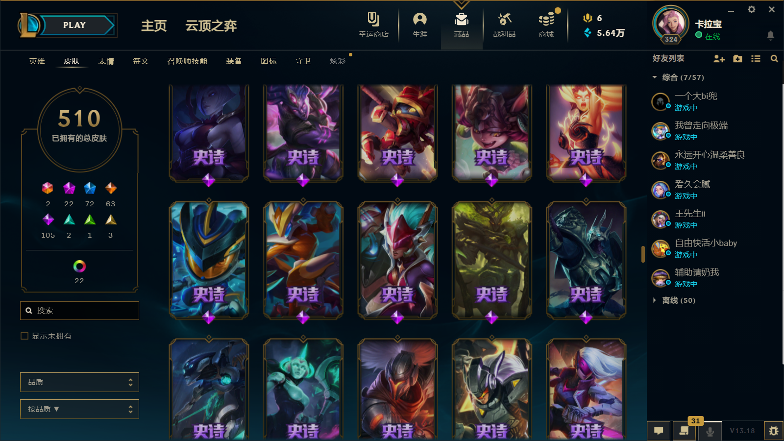 510皮肤 22炫彩 大元素使 DJ琴女 海克斯小炮 海克斯鳄鱼 灰烬莫德凯撒 灰烬派克 灰烬慎 海克斯人马 水晶雷欧娜 海克斯希维尔