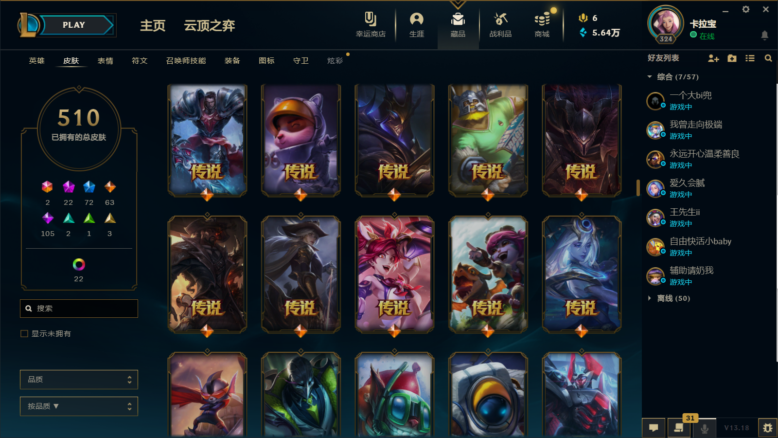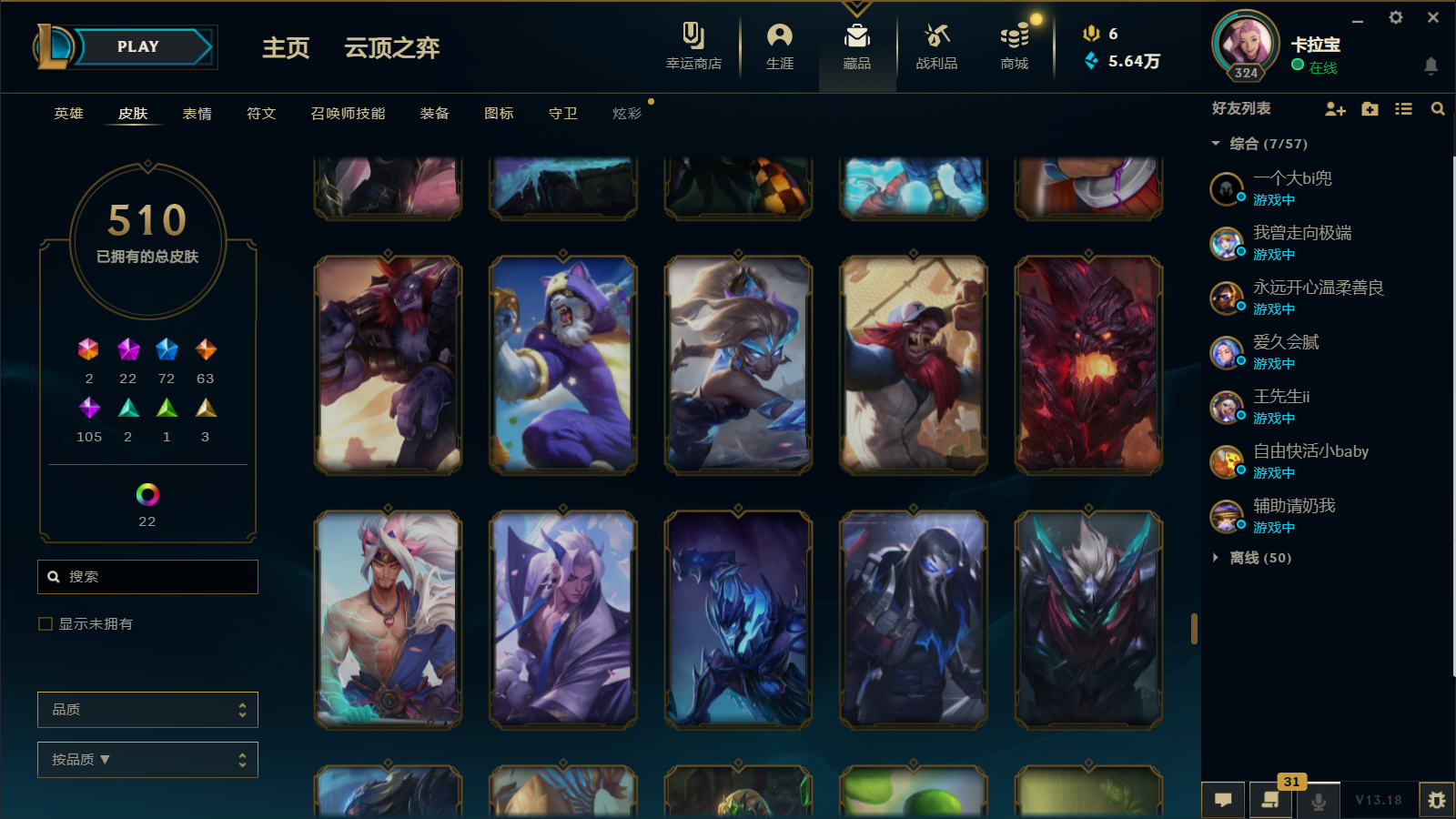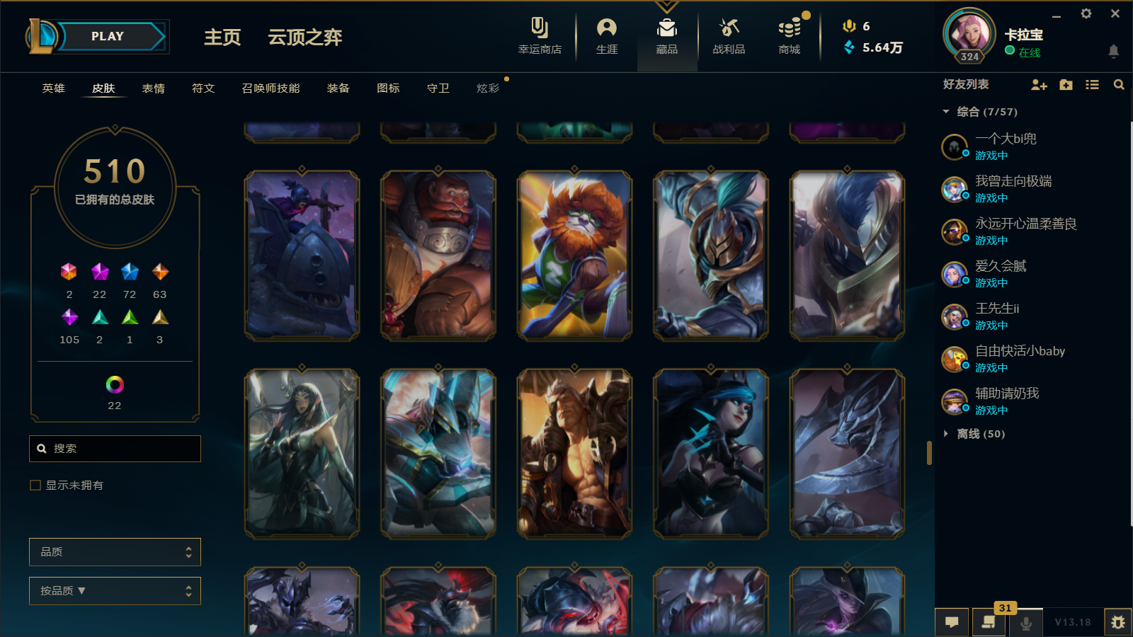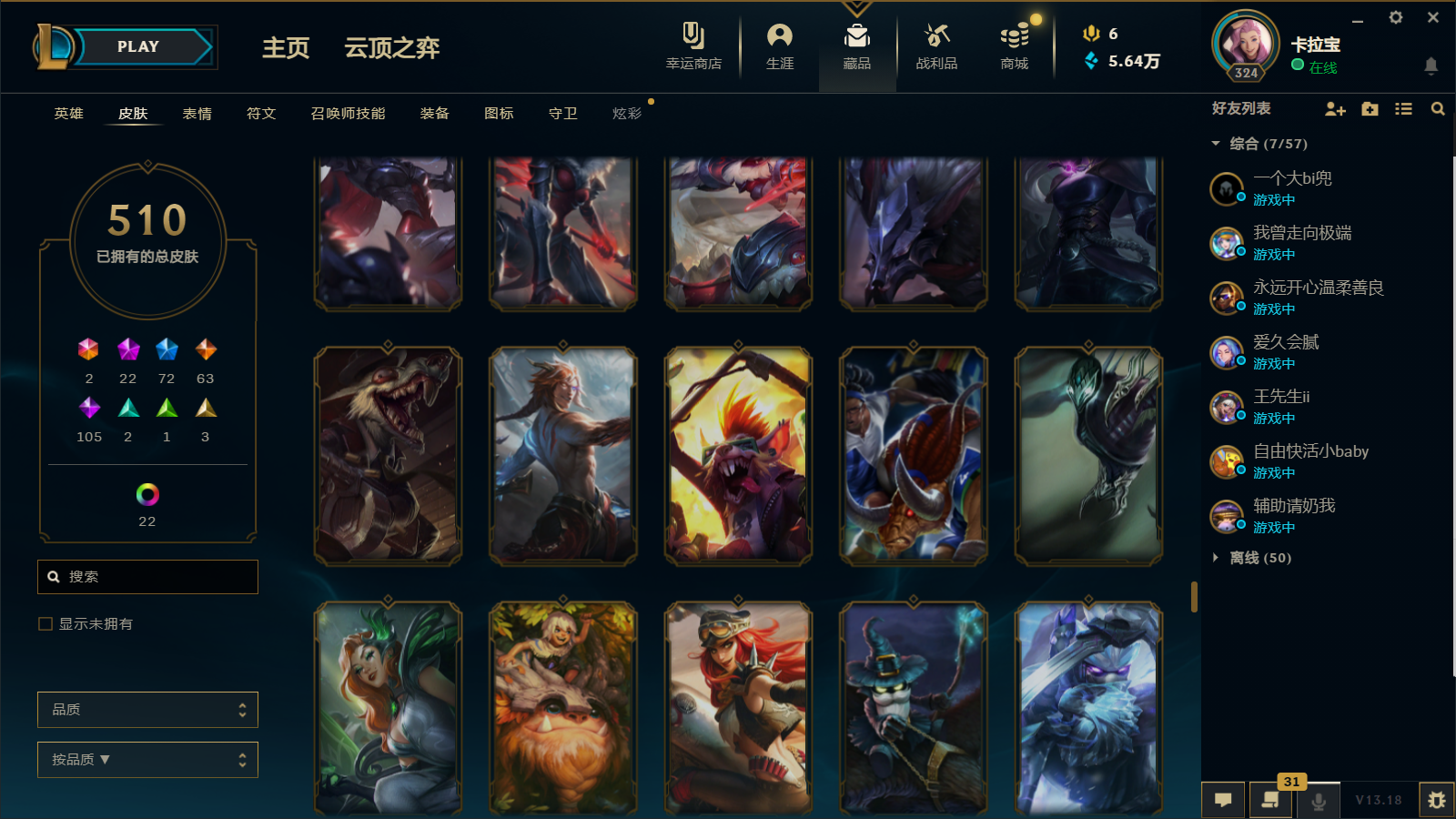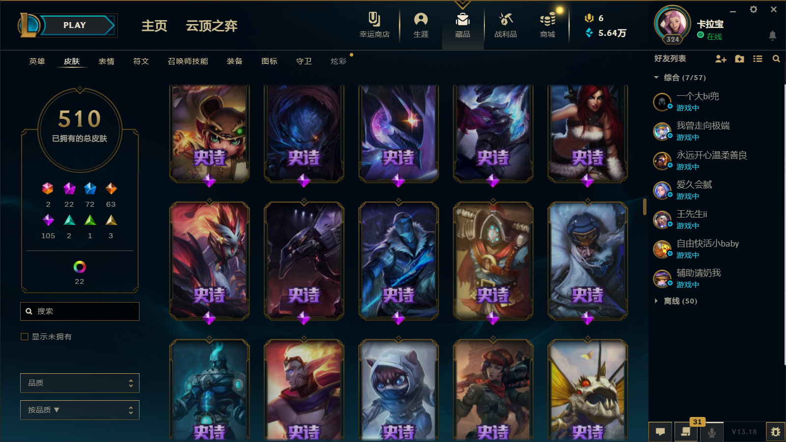 510皮肤 22炫彩 大元素使 DJ琴女 海克斯小炮 海克斯鳄鱼 灰烬莫德凯撒 灰烬派克 灰烬慎 海克斯人马 水晶雷欧娜 海克斯希维尔