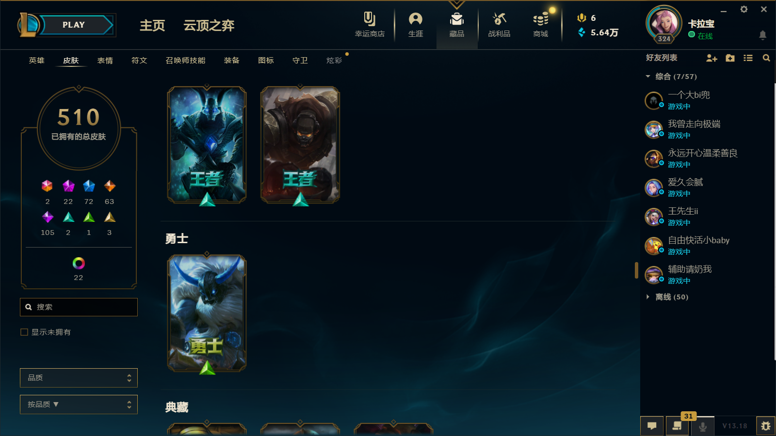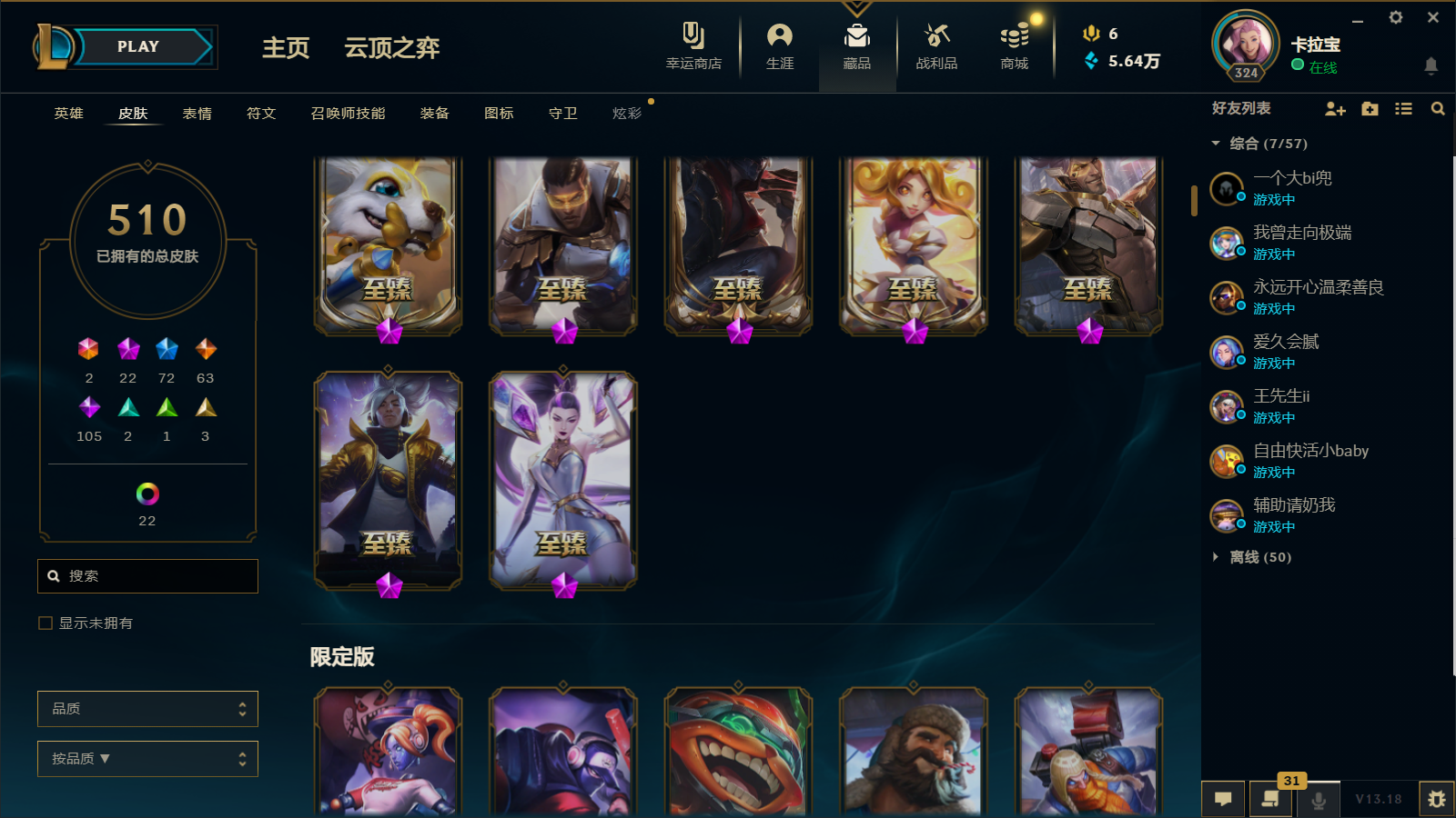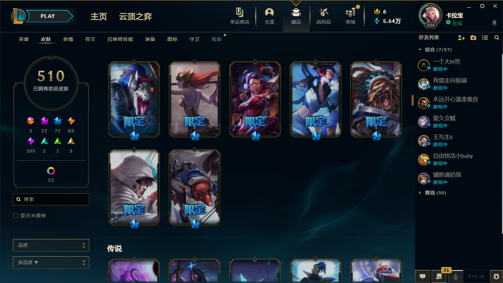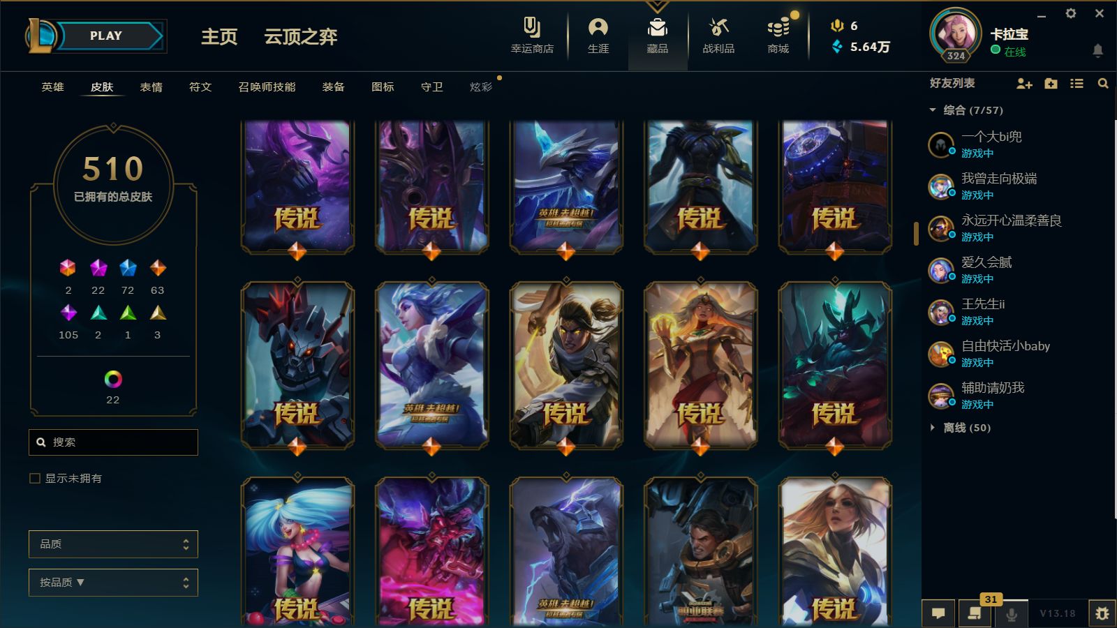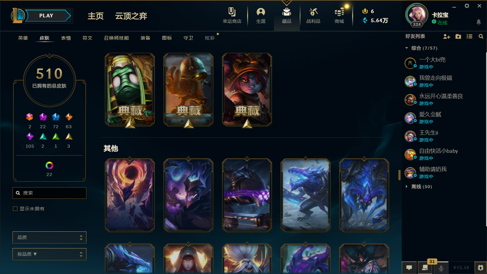 510皮肤 22炫彩 大元素使 DJ琴女 海克斯小炮 海克斯鳄鱼 灰烬莫德凯撒 灰烬派克 灰烬慎 海克斯人马 水晶雷欧娜 海克斯希维尔